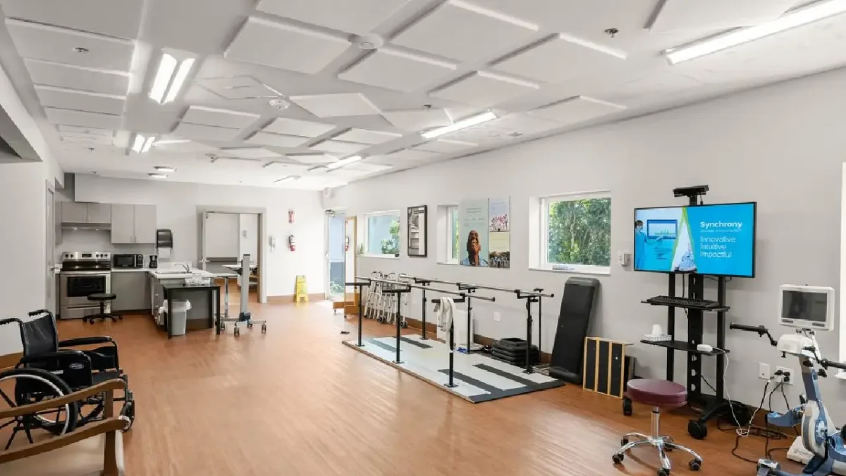 Interior, Facilities, and Therapy Rooms at Gresham Post-Acute Care And Rehab A reception area with a dark wood desk, a large wall clock, and a gray carpeted floor, leading into a hallway A hallway with wood floors and a seating area with a gray couch, a light blue armchair, and a landscape painting A common area with a patterned gray couch, a matching armchair, a side table, and a large open doorway leading to a reception area A physical therapy room with parallel bars, exercise equipment, a kitchenette, and two wheelchairs A physical therapy room with a parallel bar track, exercise equipment, and a kitchenette area in the background A nurses' station with a curved desk, computers, and medical equipment, with open doorways leading to patient rooms and other areas A small sitting room with two brown leather armchairs, a wooden side table, and a framed picture on the wall A long, empty hallway with wood floors, handrails, and closed doors on both sides, with a framed picture on the right wall